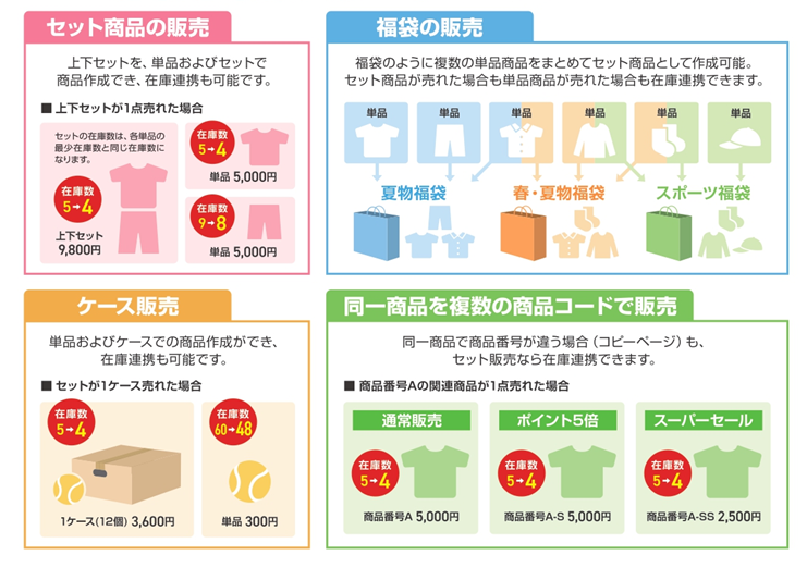 上下セットなどのセット商品、福袋のようなセット商品、セール用のコピー商品など、さまざまな形での在庫連携に対応しています。