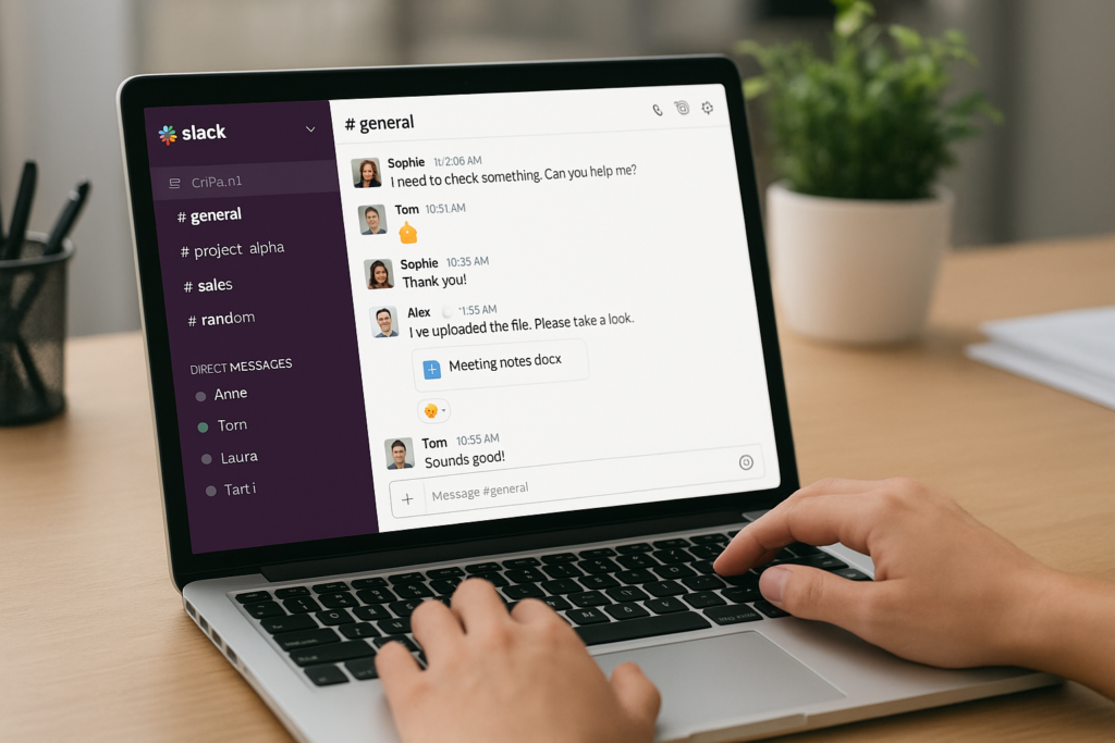 LINEのように使用できるビジネス向けのチャットツールで、部署ごと、プロジェクトごとにチャンネルを分けており、テキストやファイルをすぐに共有できます。