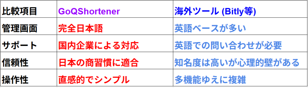 上記の海外勢と比較した際、GoQShortenerには日本国内ユーザーにとっての明確なメリットがあります。