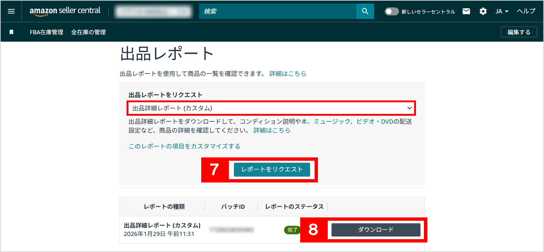 【7】[出品詳細レポート(カスタム)]を選択し、[レポートをリクエスト]をクリックします。