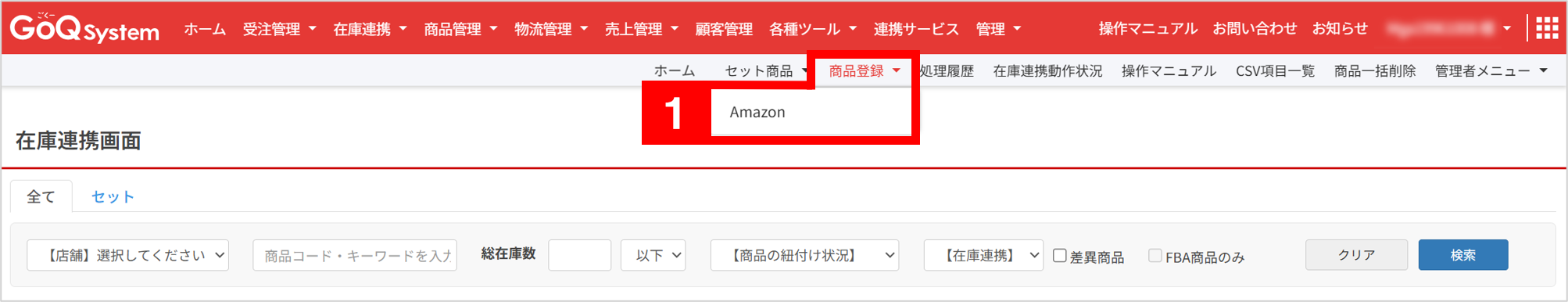 【1】在庫連携画面上部[商品登録>Amazon]をクリックします。
