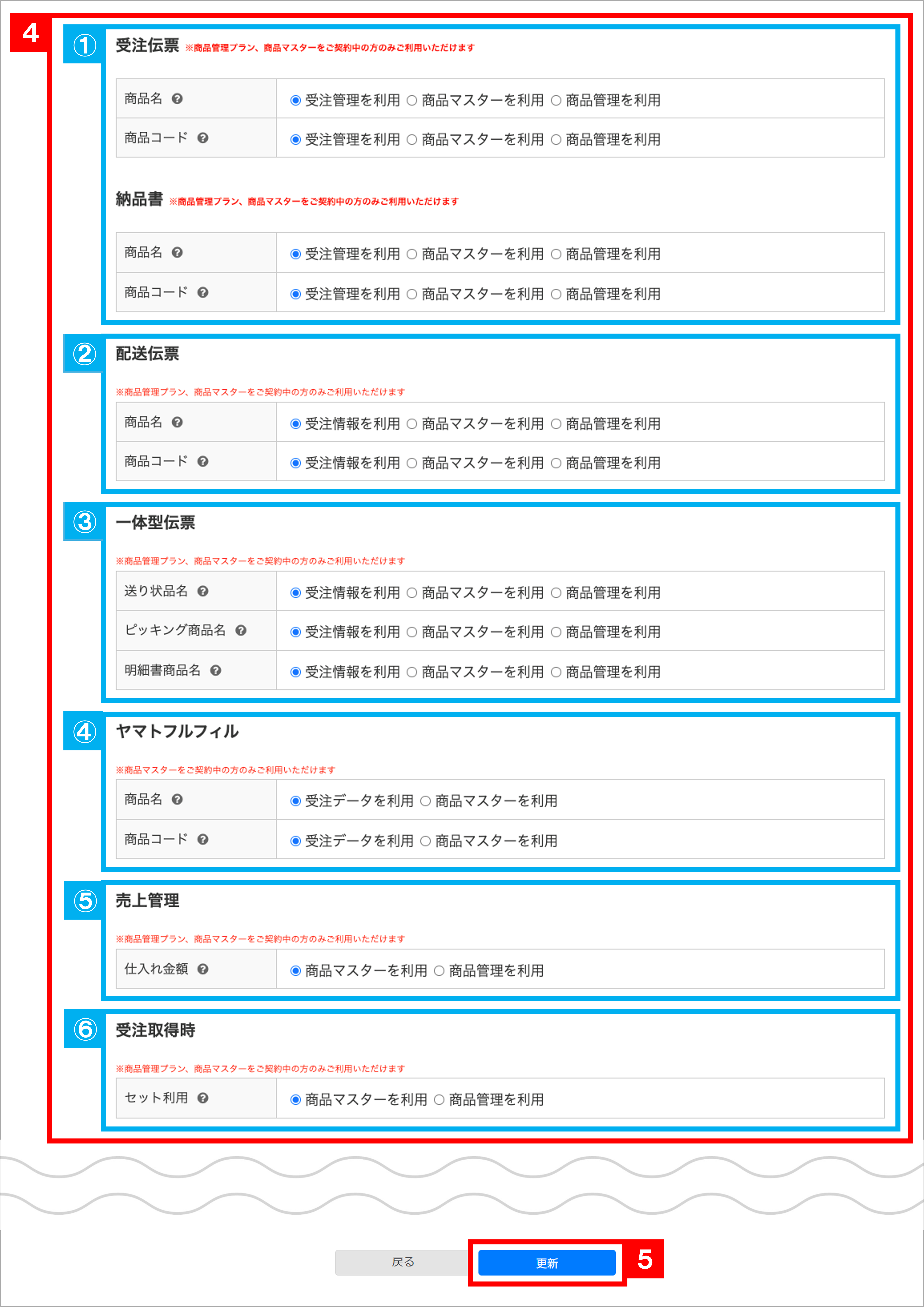 【4】各項目について受注管理・商品マスター・商品管理のどのデータを利用するか設定します。