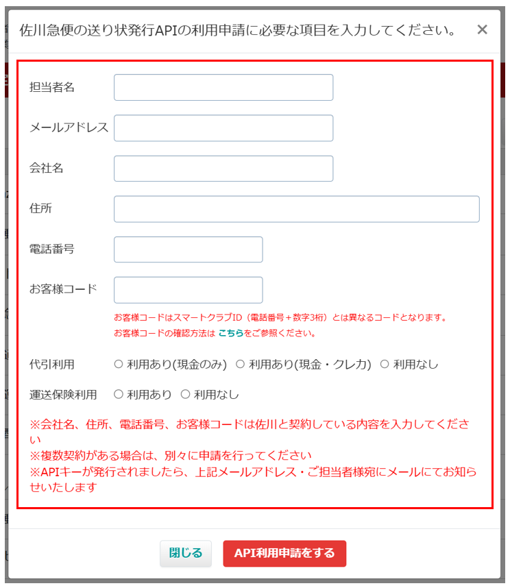 佐川急便の送り状発行APIを利用するには、佐川急便へのAPI利用申請が必要となります。