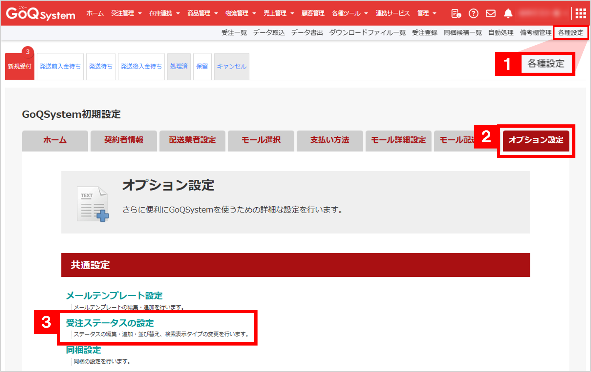 【3】[受注ステータスの設定]をクリックします。