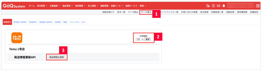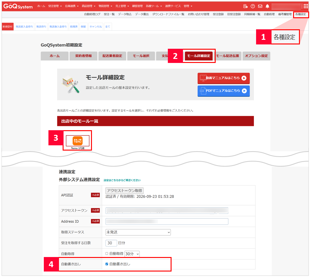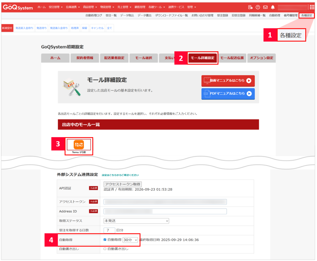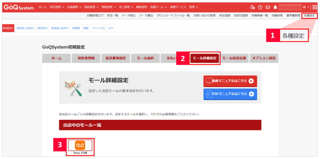 ※受注一覧画面に画面遷移した場合、お手数ですが再度Temuのモール詳細画面に移動してください