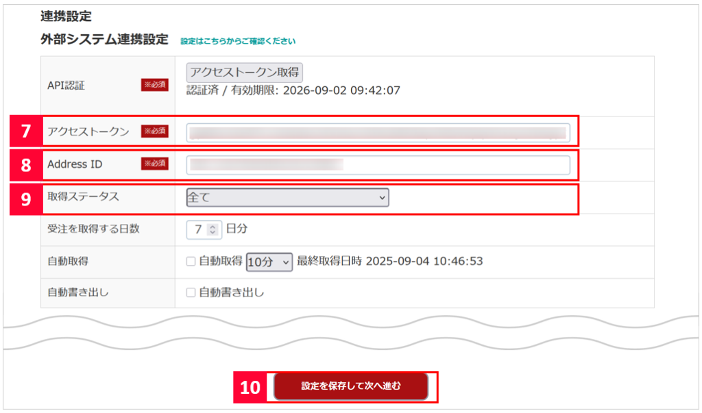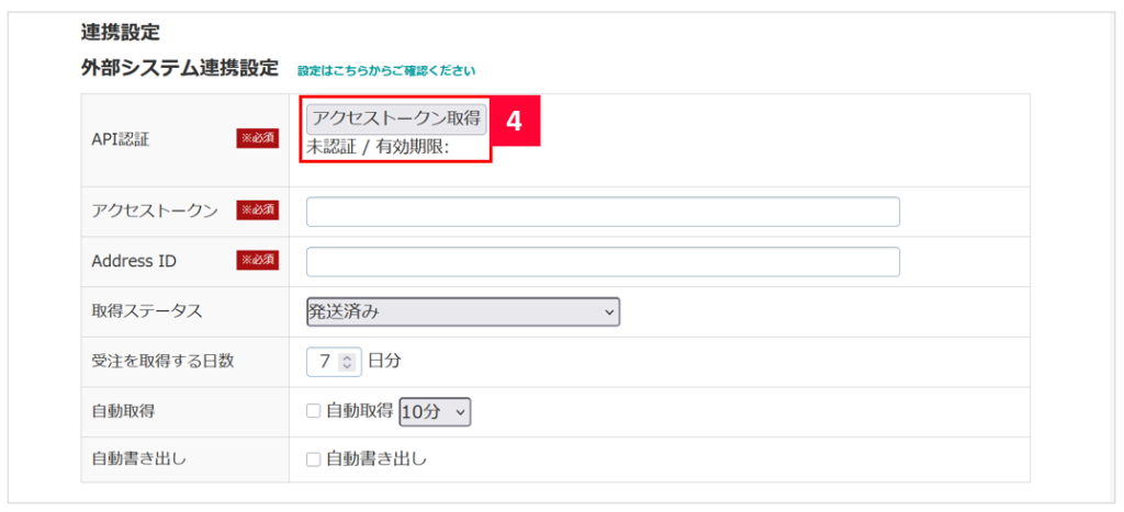 【4】外部システム連携設定内の[自動取得]にチェックを入れます。