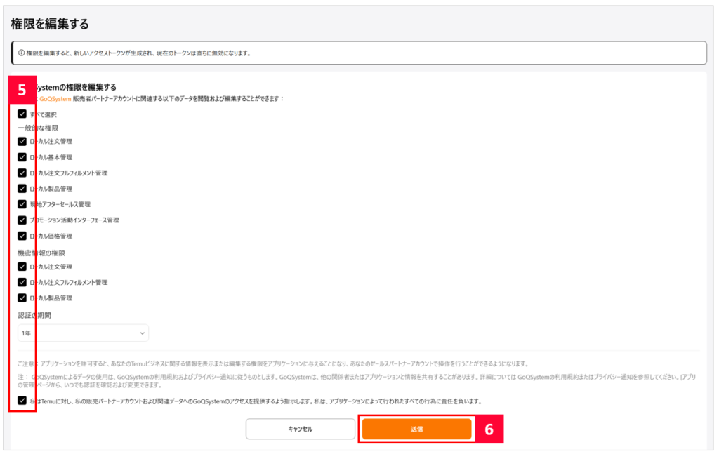 【5】Temuの管理画面上にてチェックボックスすべてにチェックを入れて、
