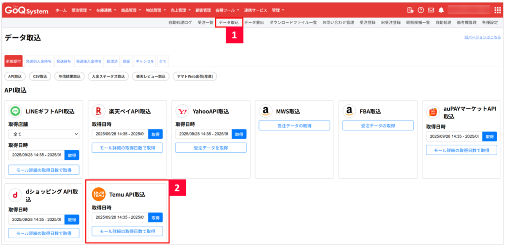 【2】Temu API取込より、[モール詳細の取得日数で取得]もしくは[取得]ボタンをクリックします。