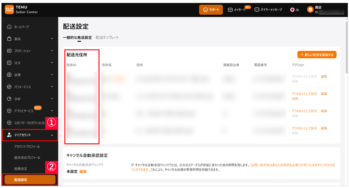※住所IDはTemu seller Center上> ①マイアカウント > ②配送設定 よりご確認ください