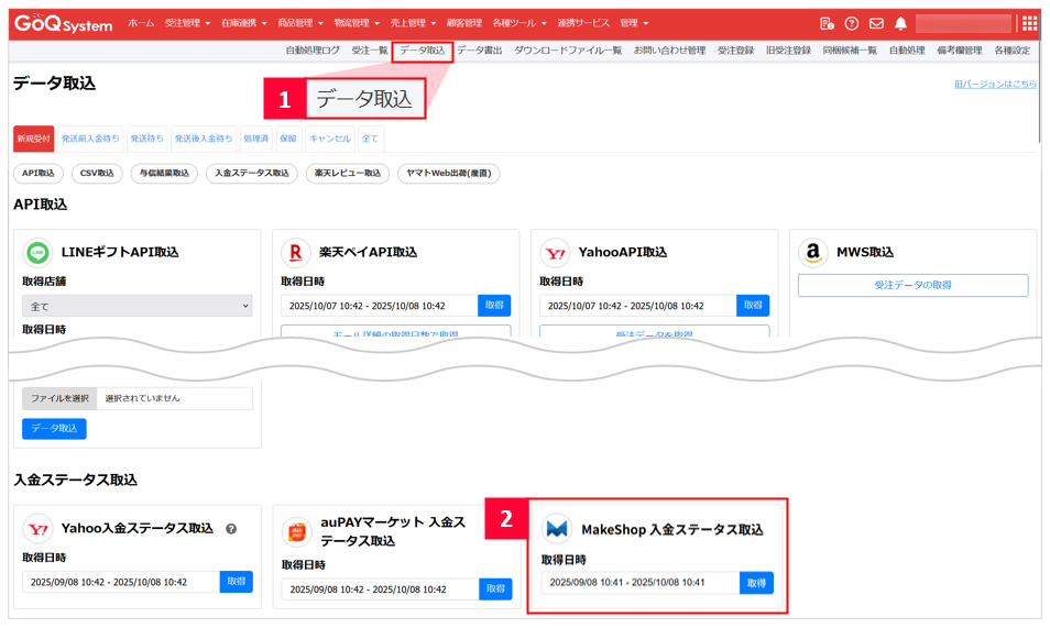 【2】[Makeshop入金ステータス取込]より、入金日を取得したい注文が含まれる期間を指定し、[取得]をクリックします。