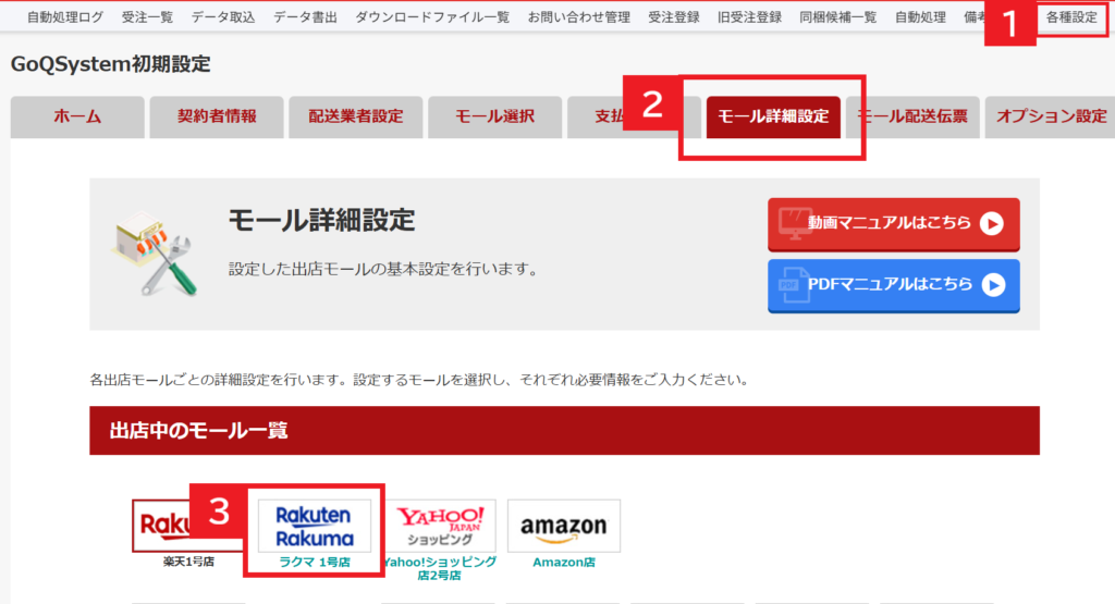 【1】GoQSystem受注管理にログインをし[各種設定]をクリックします。