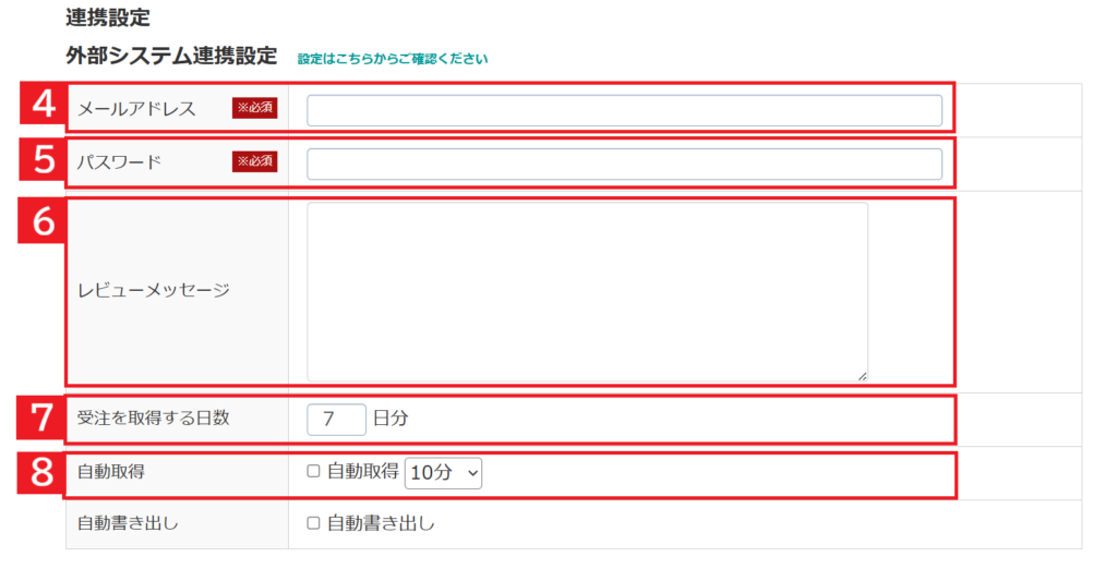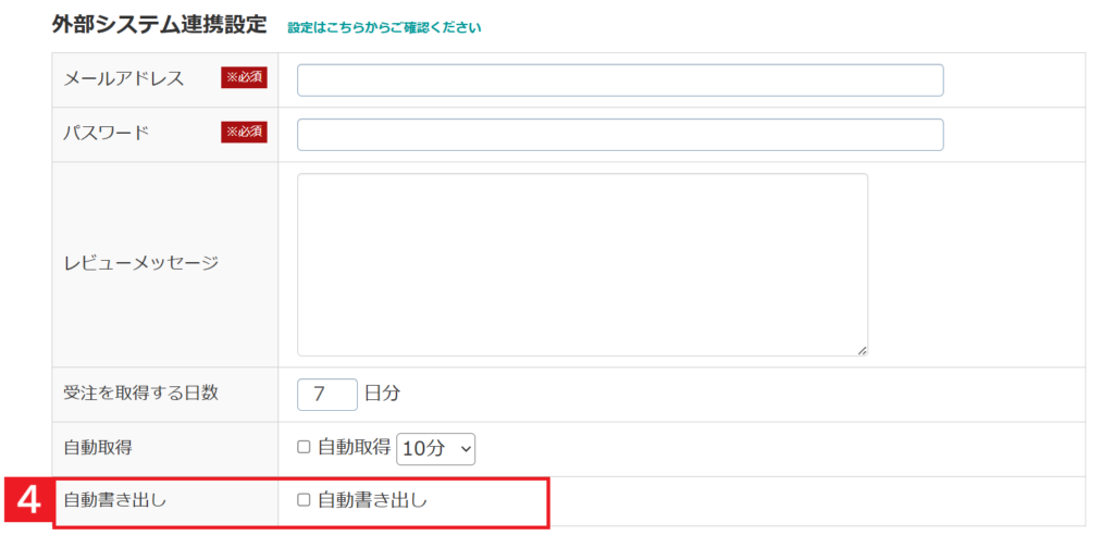 【4】外部システム連携設定[自動書き出し]にチェックをつけて下さい。