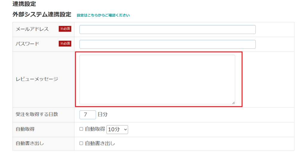 「外部システム連携設定」の[レビューメッセージ]へご入力いただいた内容をラクマへも反映します。