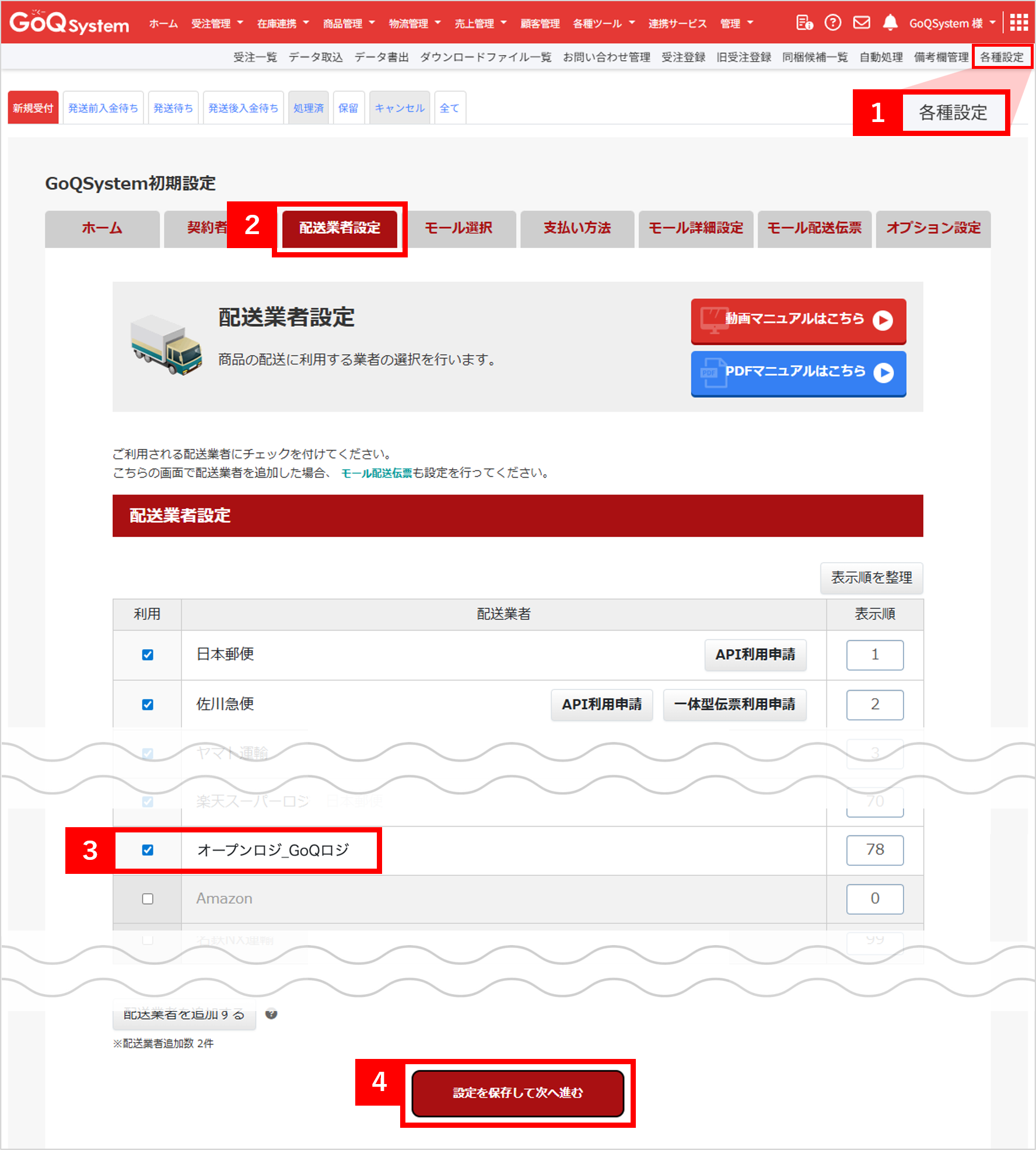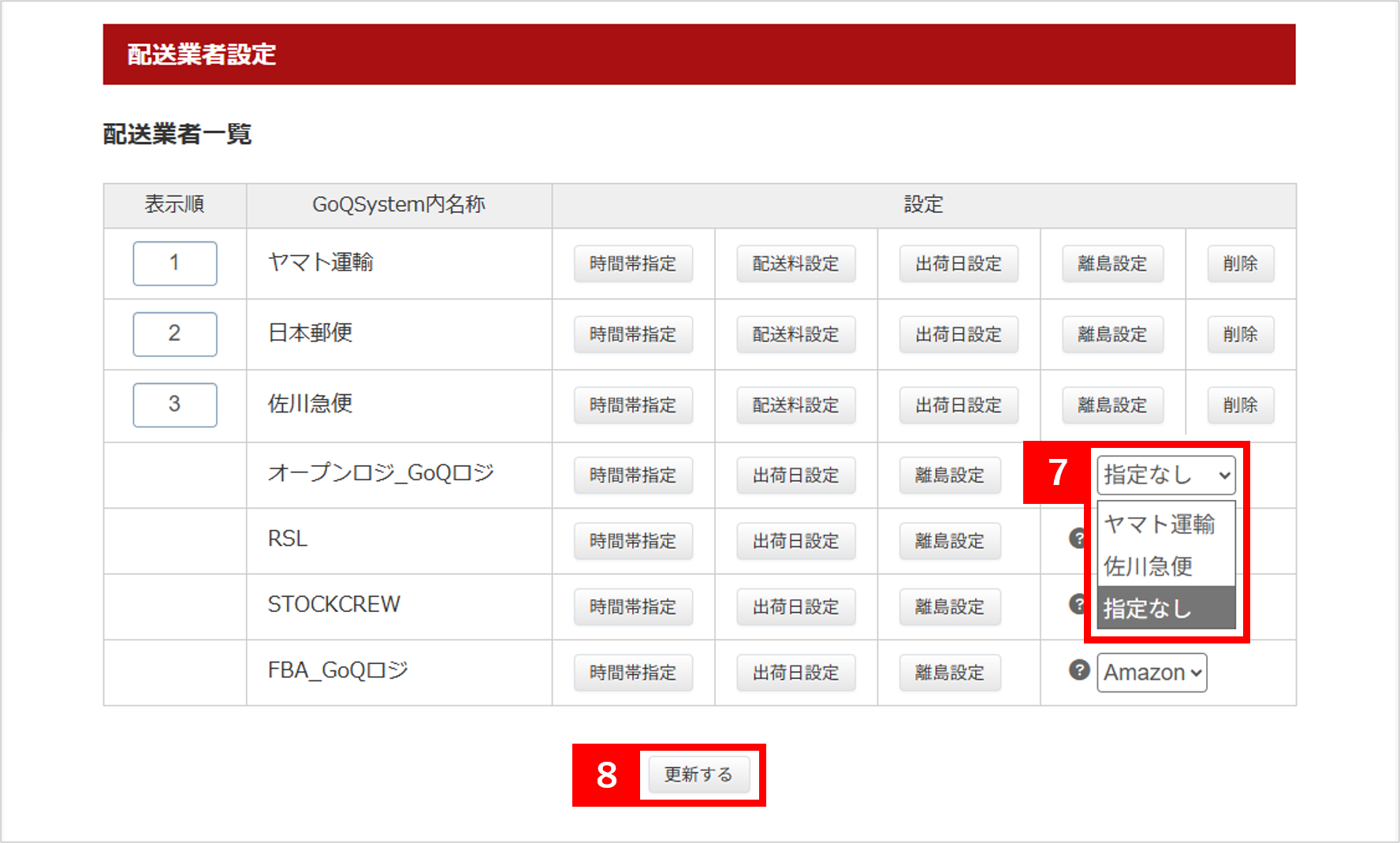 【7】オープンロジで出荷を行う際に利用する配送業者を選択します。