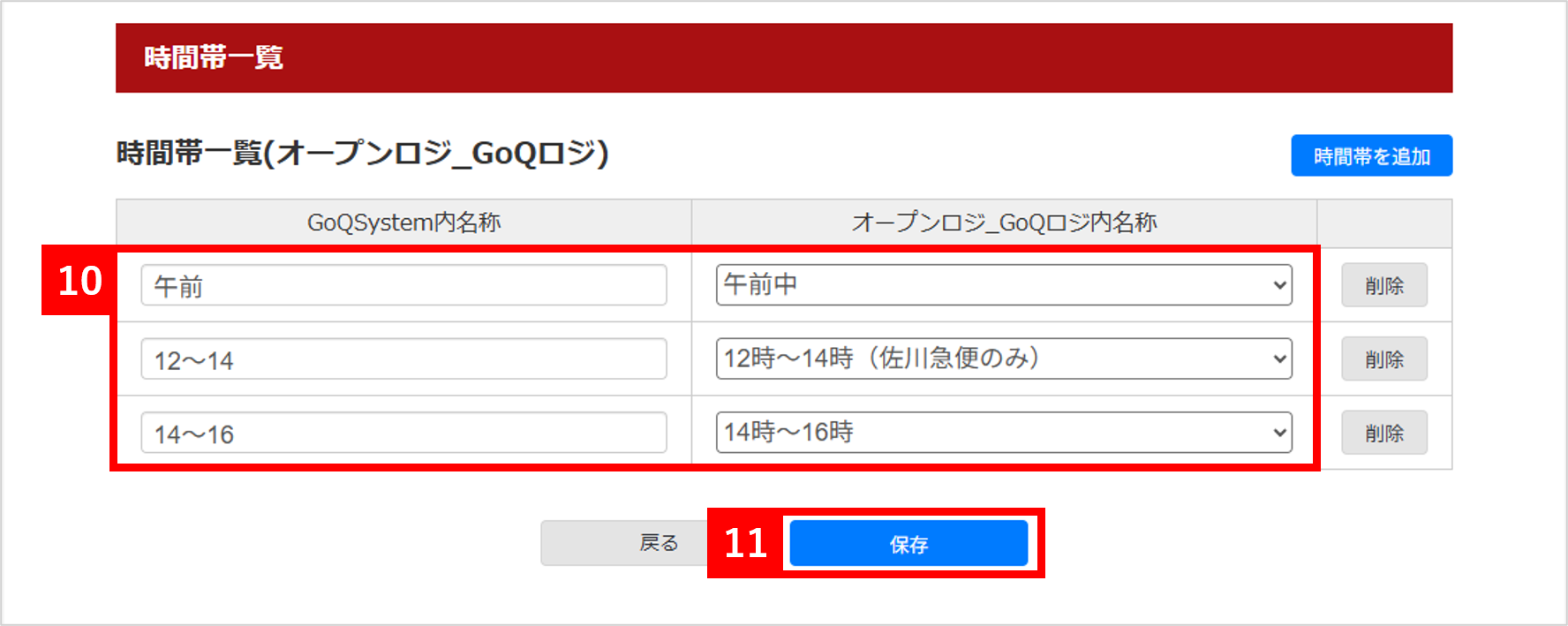【10】「GoQSystem内名称」に時間帯を入力し、「オープンロジ_GoQロジ内名称」と一致するように