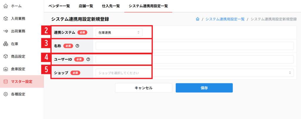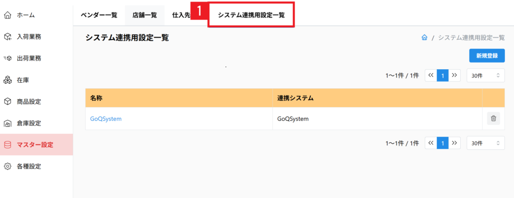 【1】[マスター設定] > [システム連携用設定一覧]をクリックします。