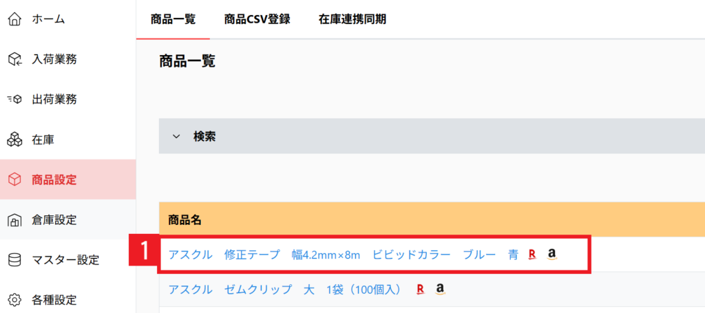 【1】[商品設定] > 在庫連携と同期したい商品をクリックします。