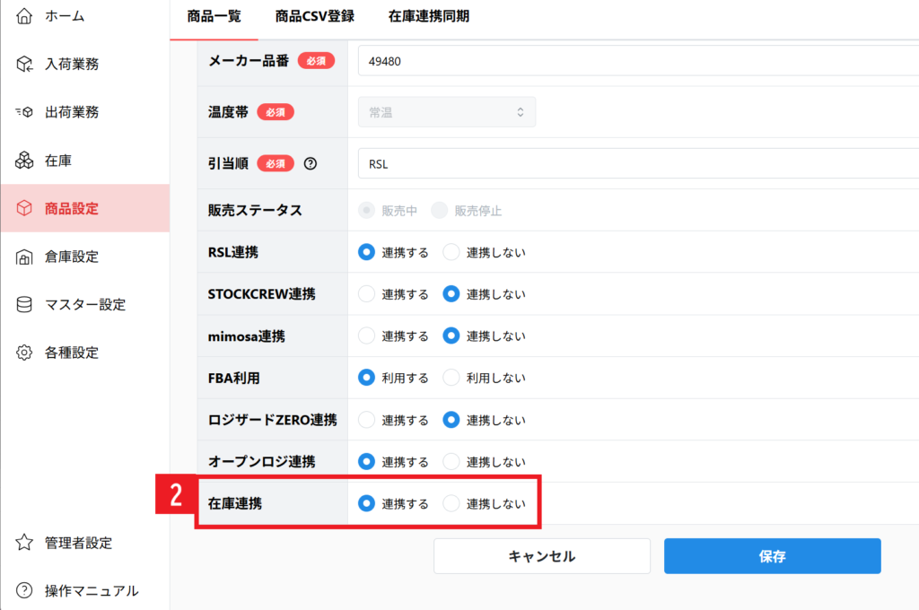 【2】[在庫連携] >「連携する」を選択して保存をクリックします。