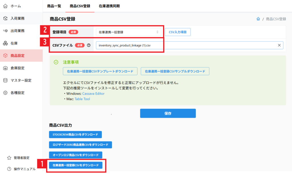 【1】[商品設定] > 商品CSV登録 > 「在庫連携一括登録CSVをダウンロード」をクリックしてCSVをダウンロードします。