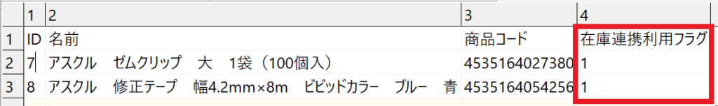②在庫連携と同期する商品の「在庫連携利用フラグ」を「1」に書き換えて保存します(初期値は0が入力されています)