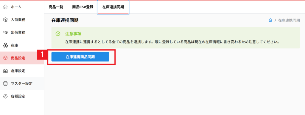 【1】[商品設定] > 在庫連携同期 > 「在庫連携商品同期」をクリックします。