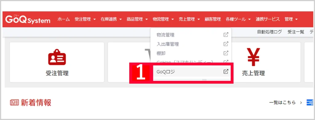 【1】管理画面上部の[物流管理]内の[GoQロジ]をクリックし、GoQアカウントでログインします。