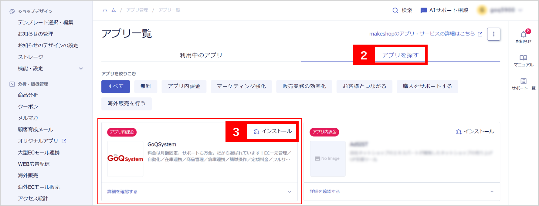 【3】GoQSystemのアプリを探し、[インストール]をクリックします。