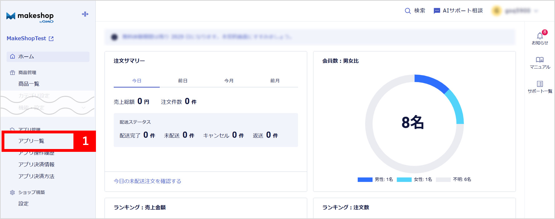 【1】makeshop管理画面にログインし、[アプリ一覧]をクリックします。