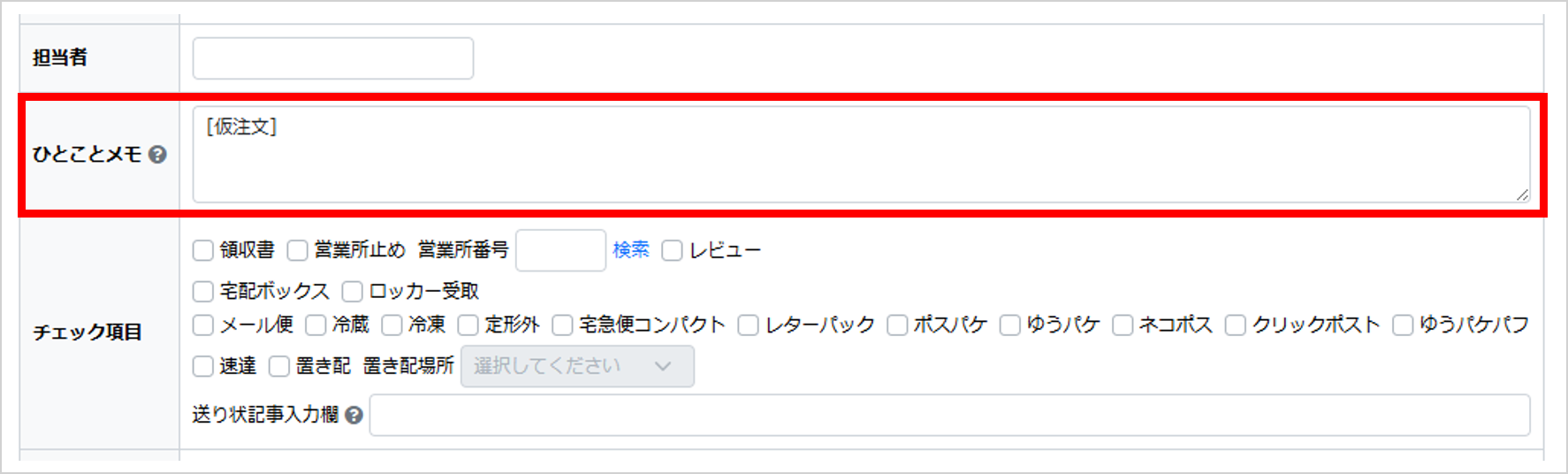 makeshop側で決済が完了していない場合、受注取得時に【ひとことメモ】に[仮注文]という文言が取り込まれます。