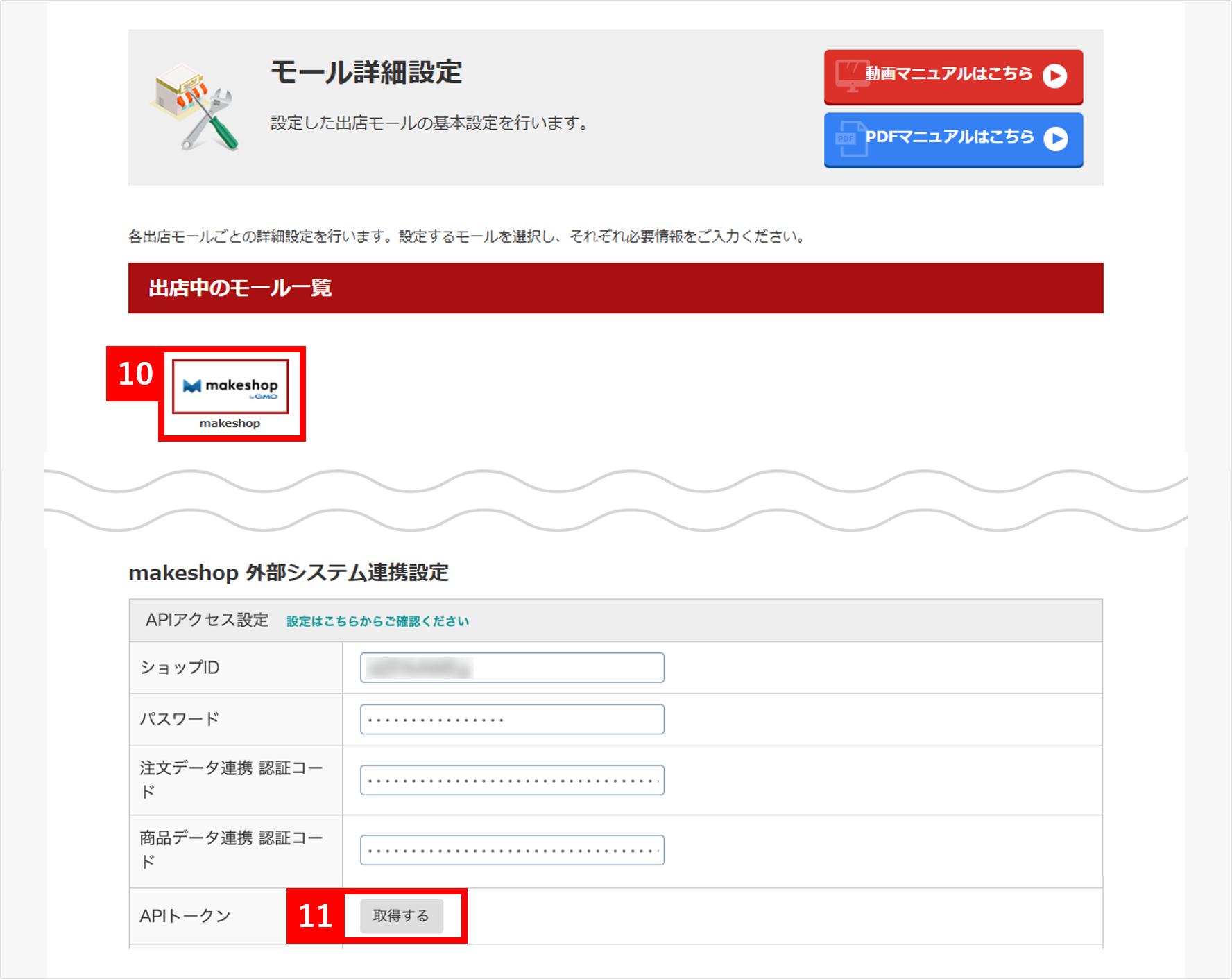 【11】makeshop外部システム連携設定より、APIトークンの[取得する]をクリックします。