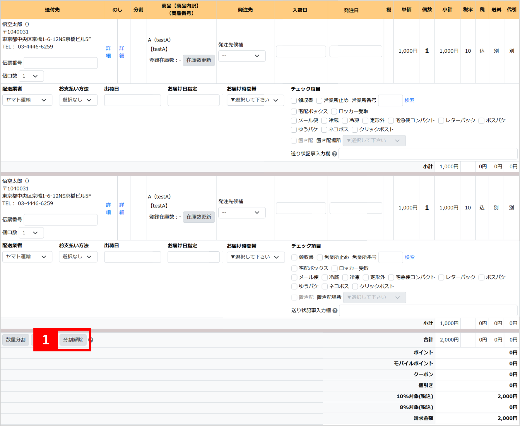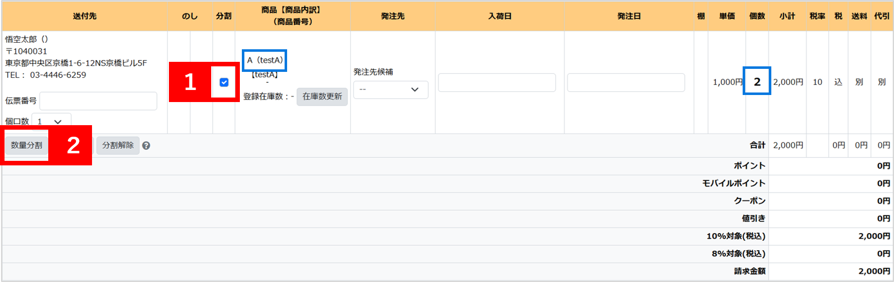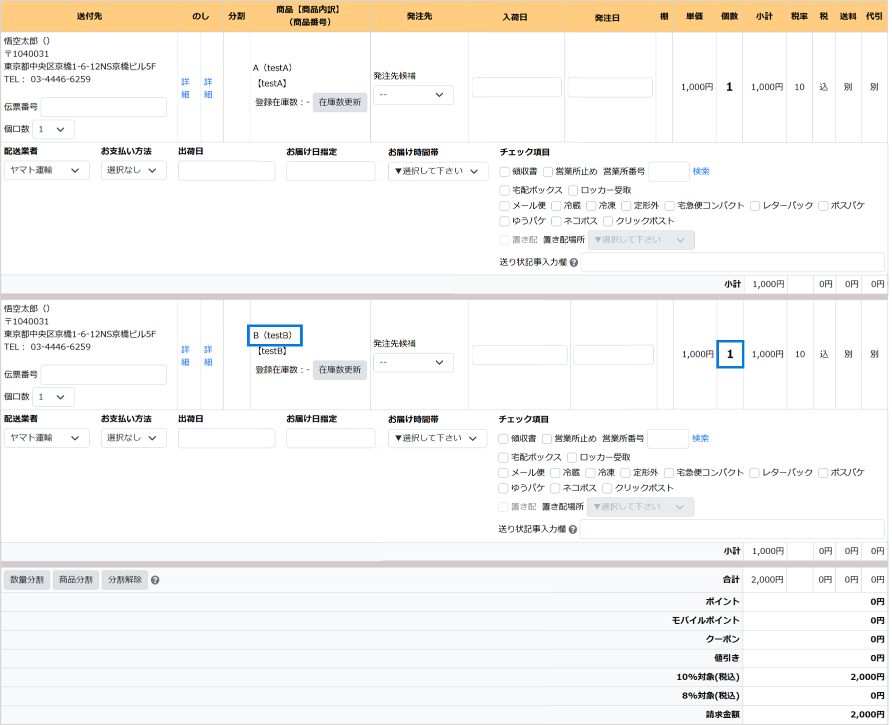同一商品を分割する場合に使用します(Aの商品を複数個注文されている状態で分割する場合)