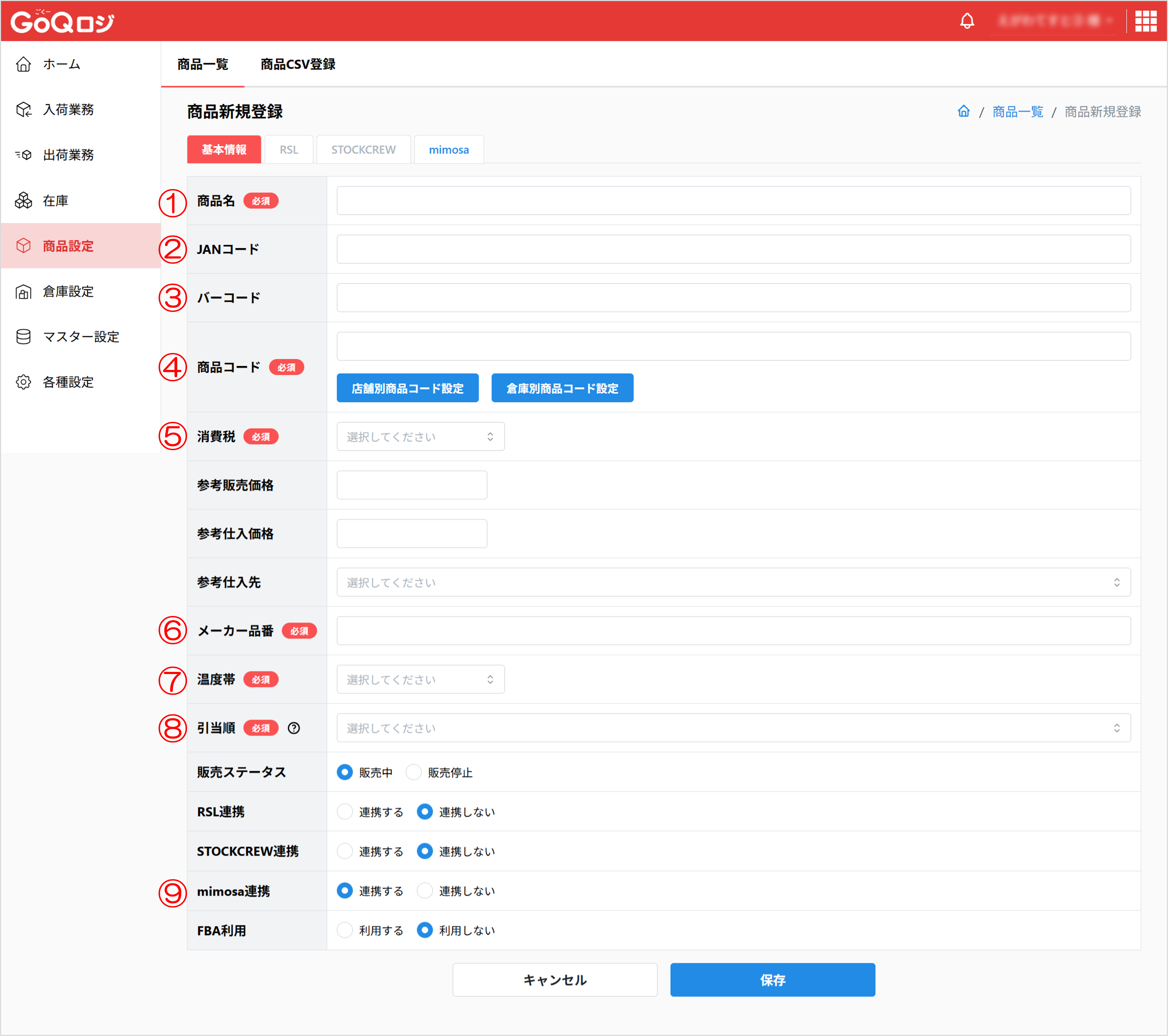 | 倉庫別商品コード | ー | 各拠点で独自にコードを設定している場合こちらで紐づけることが可能です。 |