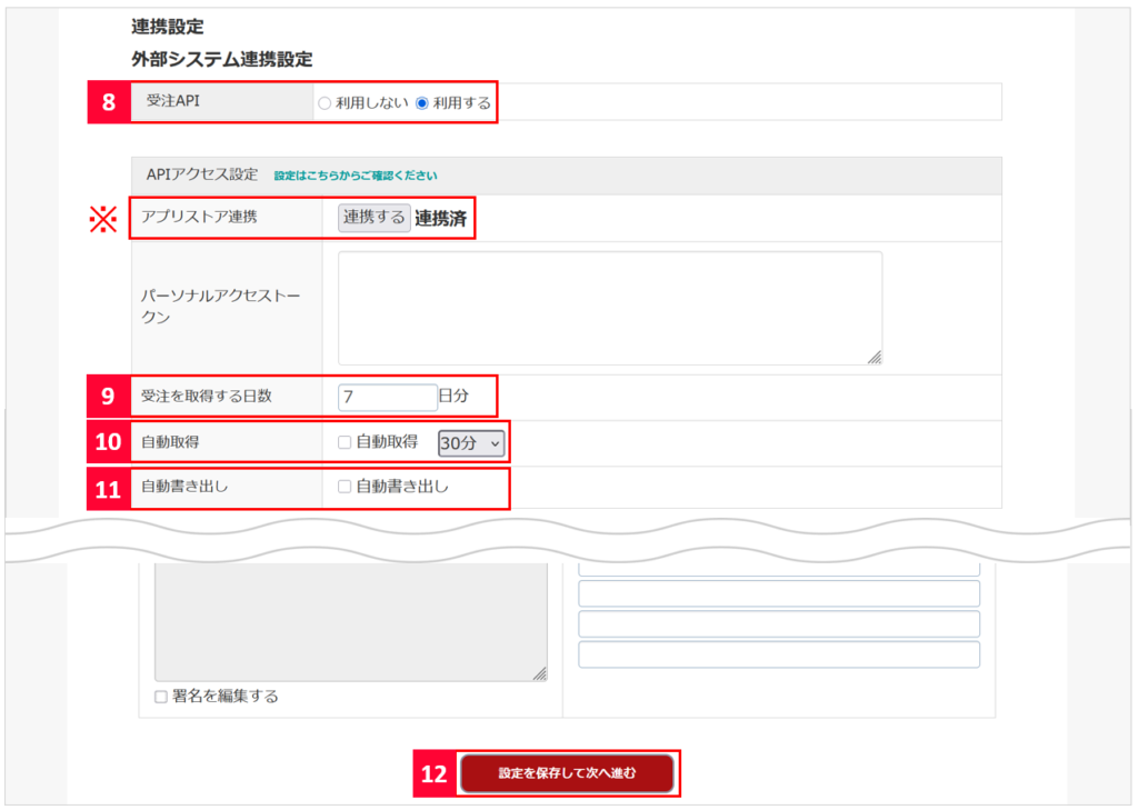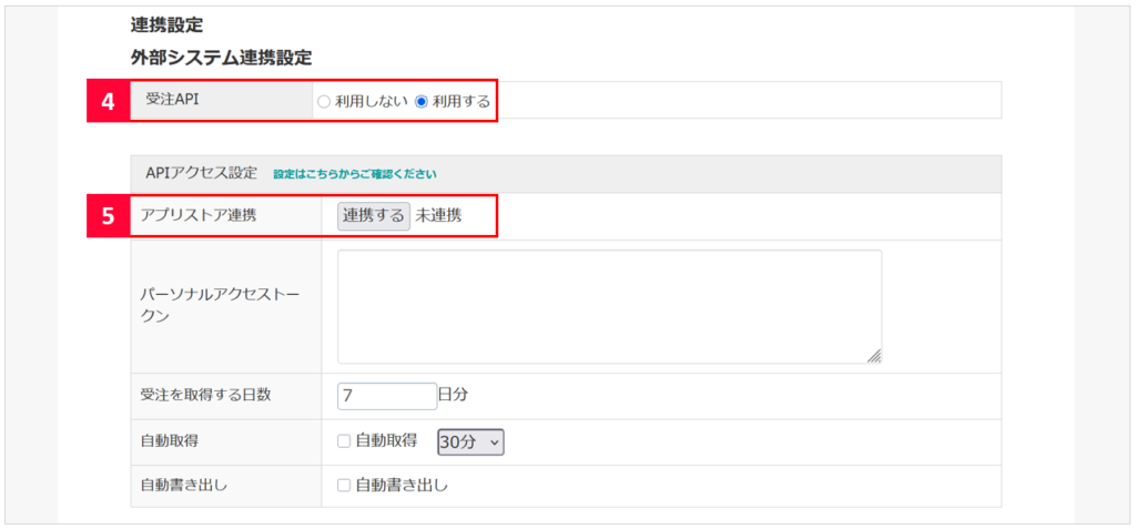 【4】外部システム連携設定内の受注APIを[利用する]に変更します。