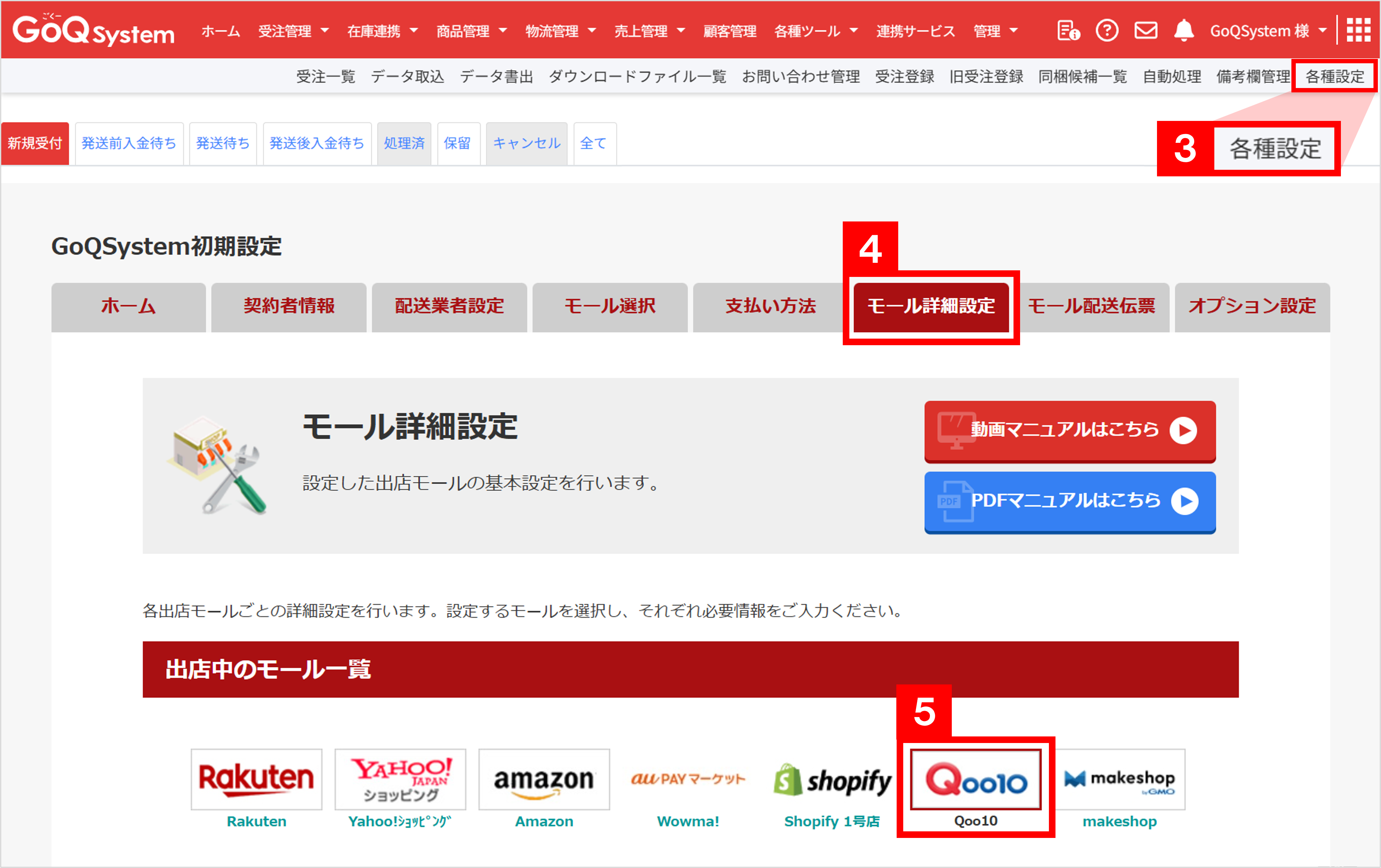 【5】出店中のモール一覧から[Qoo10]を選択します。